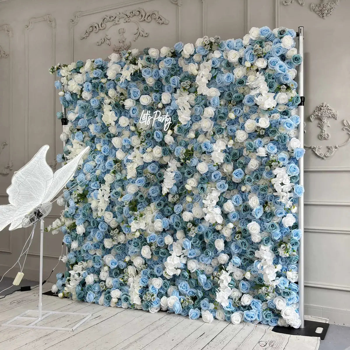 Flower Wall 3D Blue White Rose Fabric Rolling Up Curtain Floral Backdrop Wedding Party Proposal Decor